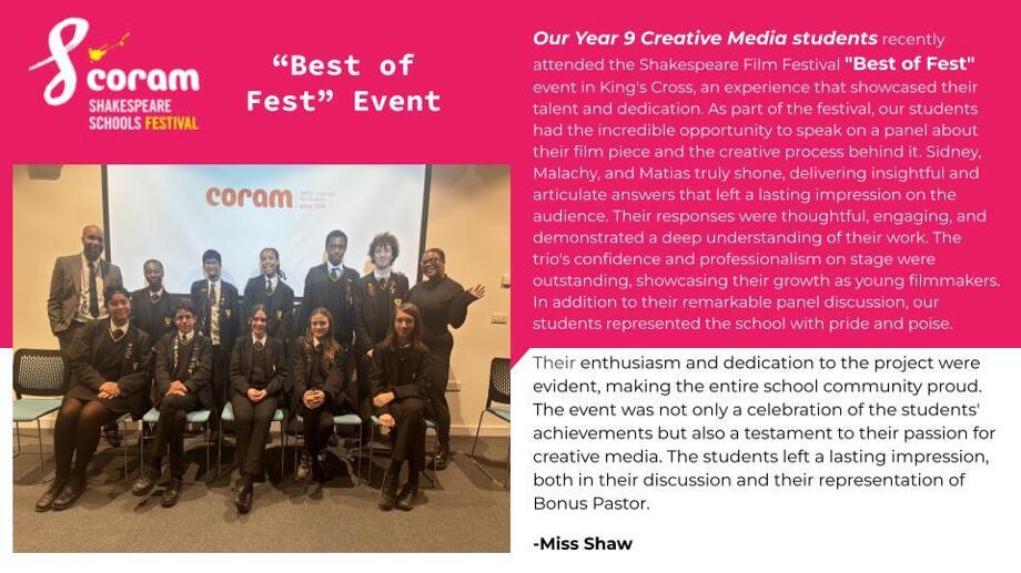 BackOur Year 9 Creative Media students recently attended the Shakespeare Film Festival "Best of Fest" event in King's Cross, an experience that showcased their talent and dedication. As part of the festival, our students had the incredible opportunity to speak on a panel about their film piece and the creative process behind it. Sidney, Malachy, and Matias truly shone, delivering insightful and articulate answers that left a lasting impression on the audience. Their responses were thoughtful, engaging, and demonstrated a deep understanding of their work. The trio's confidence and professionalism on stage were outstanding, showcasing their growth as young filmmakers. In addition to their remarkable panel discussion, our students represented the school with pride and poise.